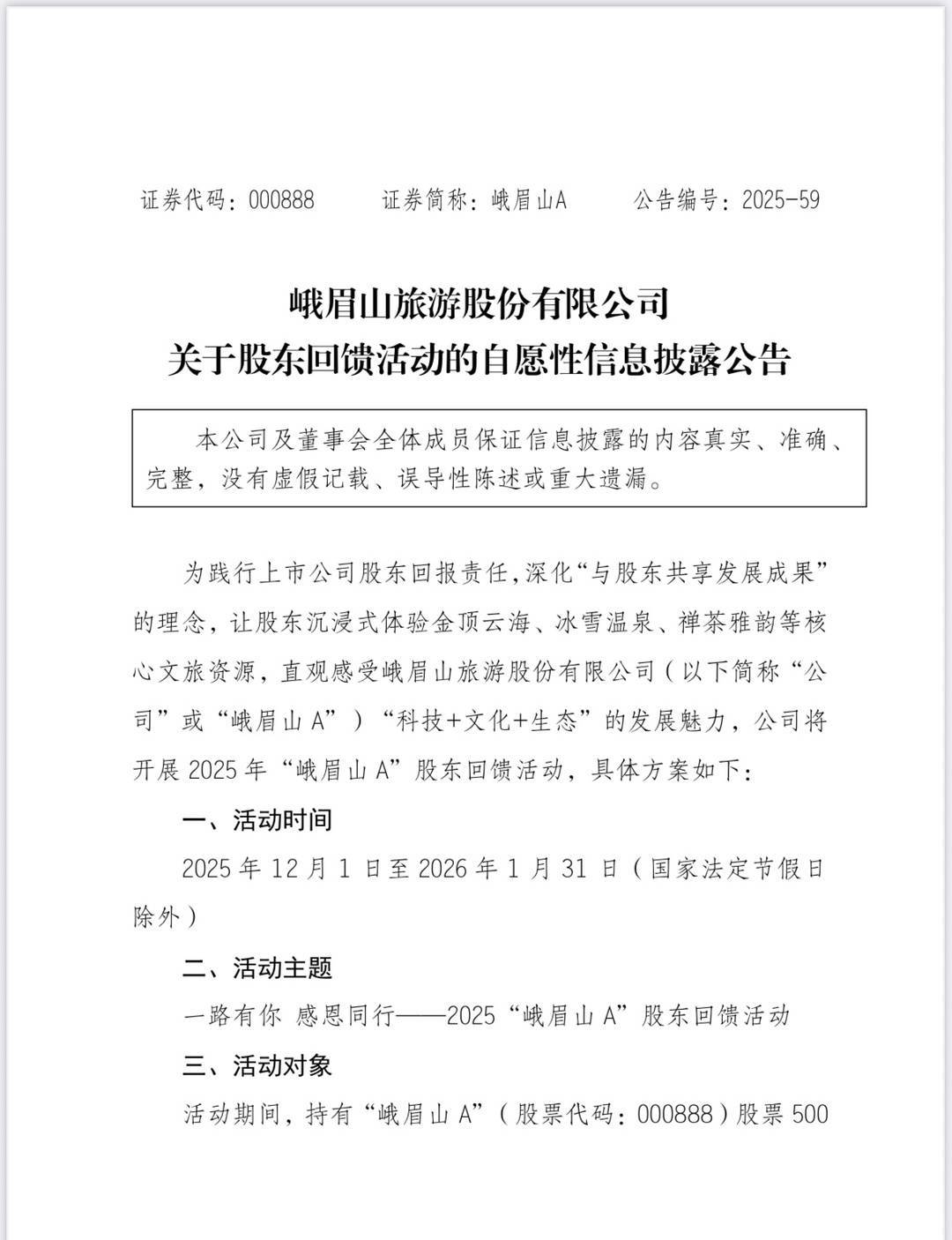公告称,个人股东每次可携带两名随行家属,家属可享受进山门票和万年索折优惠。每家法人股东可指名代表。